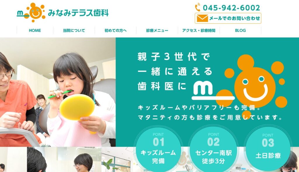 | みなみテラス歯科 | 保育士在籍&キッズスペース完備で、子どもが楽しく通える環境作りが特徴 | センター南駅より徒歩3分 | 祝日、第二・第四日曜日 |