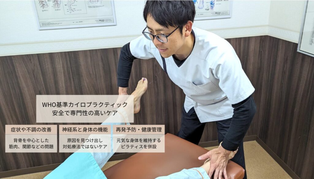 | 主な施術・特徴 | WHO基準カイロプラクティックによるカイロ施術で、腰痛・肩こり・自律神経系の不調など体の根本原因にアプローチ |
