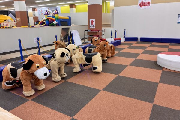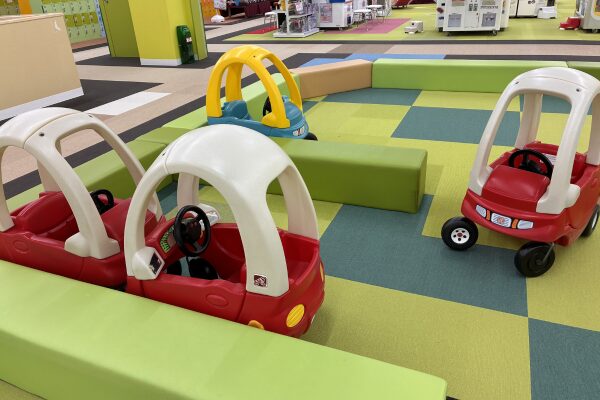 足で漕ぐタイプのおもちゃの車や、動物の乗り物が用意されたコーナーです。
