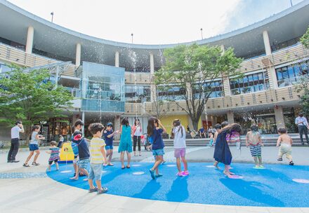 夏になると地面からリズミカルに水が噴き出し、子どもたちの歓声が響きます。